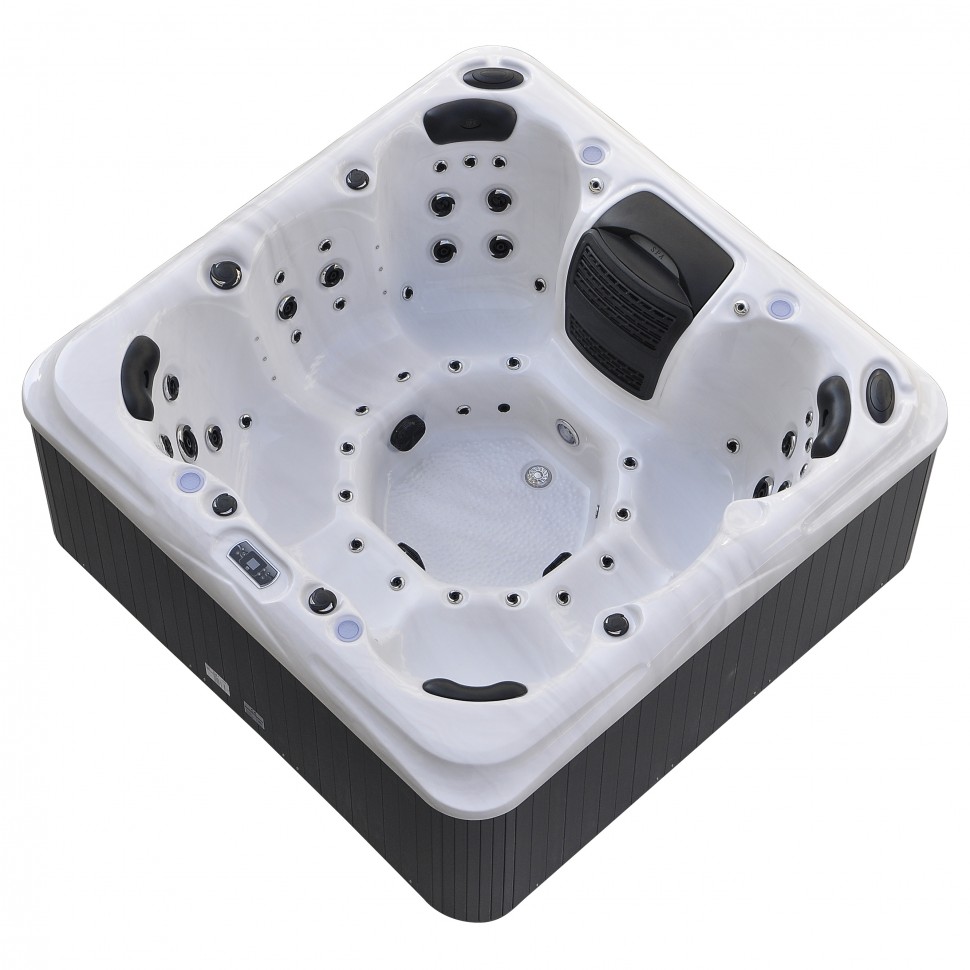 Квадратный гидромассажный комплекс размером 2200×2200×970 мм создан специально для наслаждения водными процедурами на свежем воздухе, предлагая идеальное сочетание функциональности и устойчивости к внешним воздействиям.